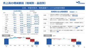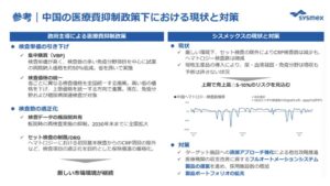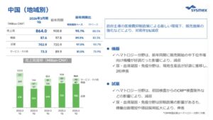 しかし、中国の売上減少は懸念材料です。中国では現在、政府主導の医療費抑制政策が実施されており、これにより検査機器の売上だけでなく、試薬やサービスの売上も下がっています。