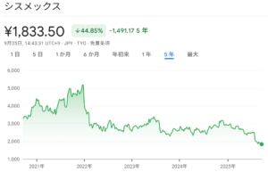 シスメックスは、売上高を中長期にわたって着実に伸ばしてきている優良企業であるにもかかわらず、株価がなんと2023年のピーク時から約65%も下落してしまっているのです。時価総額1兆円を超える大企業でこのような事態が発生するのは異例です。