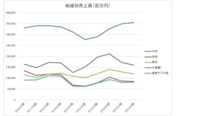 地域別売上を見ると、日本はそれほど落ち込んでいませんが、その他の地域、特に中華圏(中国を中心とした地域)が大きく低迷しています。