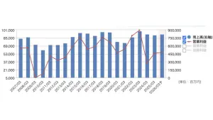 直近20年間の業績推移を見ると、リーマンショックやコロナショックの不況期を除くと、売上規模は実はこの20年間でそれほど変わっていません。あまりスケールアップはしていないという印象です。