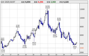 特にこの頃、コロナ禍での株式相場がかなり盛り上がり、バブルの様相を呈していたこともあり、株価は12,000円程度をつけました。しかし、その後は株価が急落し、一時は持ち直したものの、足元では4,000円に迫る水準まで下がってきており、最高値からは約1/3になってしまった状況です。