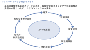 シリコンサイクルとは、一般的に3年から4年周期で繰り返される半導体市場の景気循環です。好景気で設備投資と注文が増加し工場が過剰になると、供給過剰となり、値崩れ(安売り)が発生します。一度投資した工場費用を回収するためには、需要がないにもかかわらず作り続けなければならず、利益が出なくなる不況期が訪れます。