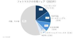 内製を除くアウトソース市場(外販)において、主要なプレイヤーはテクセンド(旧 TOPPANホールディングス)、アメリカのフォトロニクス、そして日本の大日本印刷(DNP)38.9%のシェアを持ち、統計の取り方によって1位か2位となるものの、トップクラスの地位を占めています。