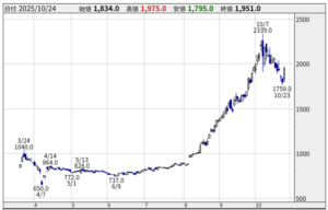 JX金属の株価は、2025年3月の上場後、それまで動きの少ない展開が続いていましたが、8月に決算を発表して以降、ポンと急騰しました。株価はあれよあれよという間に上昇し、2倍から2.5倍程度になっています。
