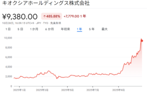 キオクシアは2024年末に再上場を果たしましたが、当時の評価は決して高くなく、PBR(株価純資産倍率)はちょうど1倍程度でした。その後、緩やかな上昇を見せていましたが、特に9月の頭から10月下旬までの間に、株価はなんと3倍弱まで急騰し、PBRは5倍近くにまで達しています。