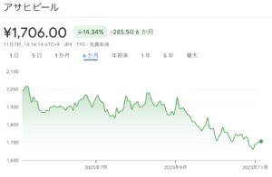 中長期的に見れば、アサヒGHDは海外成長性とビール事業の安定性、そしてインフレに強いという特性から、やがて回復してくる可能性が高いです。