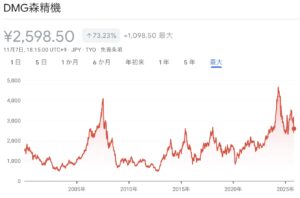 直近約20年間の株価推移を見ると、DMG森精機の株価は非常に乱高下が激しい傾向にあります。