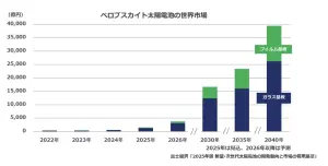 富士経済によると、ペロブスカイト太陽電池の世界市場は、2030年、2035年、2040年となるにつれて、急拡大していくと予測されています。