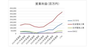 2020年以降、稼ぐ力を急速に高めており、住友電気工業を追い上げる勢いを見せています。