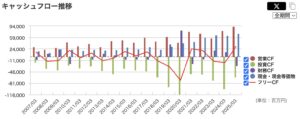 しかし、赤色で示される「フリーキャッシュフロー」を注視すると、規模が拡大しているにもかかわらず、全く伸びていないことがわかります。