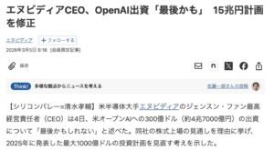 また、NVIDIAについても、本来15兆円を投資する計画だったものを、わずか300億ドル(約4.5兆円)で打ち切り、「これが最後かもしれない」と早期に手を引く姿勢を見せています。
