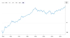 日経平均のチャートを長期で見ると、オイルショックで一時的に下がったものの、全体としては右肩上がりを維持していたのです。